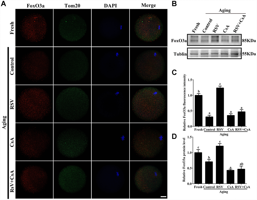 Figure 8. The involvement of FoxO3a in RSV-mediated mitophagy during oocyte aging. (A) With the treatment of RSV and CsA, the FoxO3a expression was determined by immunostaining with FoxO3a (red), Tom20 (green) and DAPI (blue). Bar = 50 μm. (B) After the indicated treatment of RSV and CsA, the FoxO3a protein expressions were measured by western blot. α-Tubulin was used as a loading control. (C) Quantitative analysis of FoxO3a fluorescence intensity in (A). (D) Quantitative analysis of FoxO3a protein expression in (B). All experiments were conducted in triplicate. Data are presented as means ± S.E.M of three independent experiments. Different lowercase letters represent the difference of expression levels that are significant (P < 0.05).