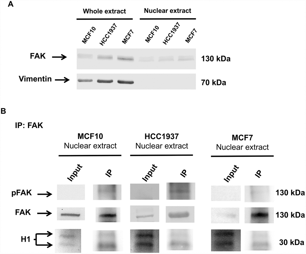 Figure 10. Immunoprecipitation analysis of nuclear FAK and histone H1. Immunoprecipitation (IP) analysis demonstrated that nuclear FAK associates with H1 histone. IP was carried out with anti-FAK antibody (3285, Cell signaling), followed by immunoblotting with anti-FAK (D2R2E, Cell signaling), anti-pFAK (Y576/577) and anti-H1 antibodies. IP experiments were done on MCF7, HCC1937 and MCF10 cell lines. The images are representative of three independent biological replicates. Panel A shows the levels of FAK in whole and nuclear extracts; Vimentin blot assess that nuclear extracts are not contaminated by cytoplasmic fraction.