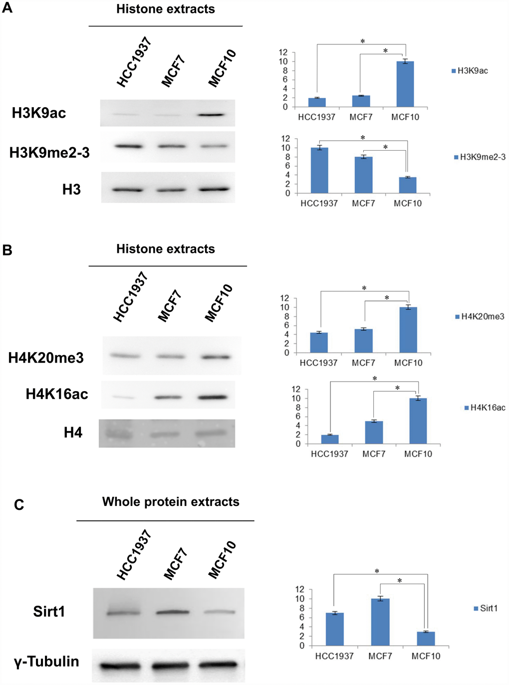 Figure 3. Western blot and densitometry analysis relative to the expression of histone marks and SIRT1 in MCF10, MCF7 and HCC1937 cells. (A) Western blot and densitometry analysis relative to the expression of histone marks in MCF10, MCF7 and HCC1937 cells. (A) H3K9ac, H3K9me2-3, PMTs signal were normalized against the total level of histone H3. (B) H4K20me3, H4K16Ac, PMTs signal were normalized against the total level histone H4. (C) Western blot and densitometry analysis of the expression levels of SIRT1 in whole protein extracts from MCF10, MCF7 and HCC1937 cells. A goat polyclonal anti-γ-Tubulin antibody was used (C-20) to confirm an equal loading of proteins. The assays were repeated in three independent biological replicates and statistically significant differences were determined using one-way ANOVA followed by Dunnett's multiple comparisons test. Data are expressed as mean ± SEM (N =3), p-value <0.05.