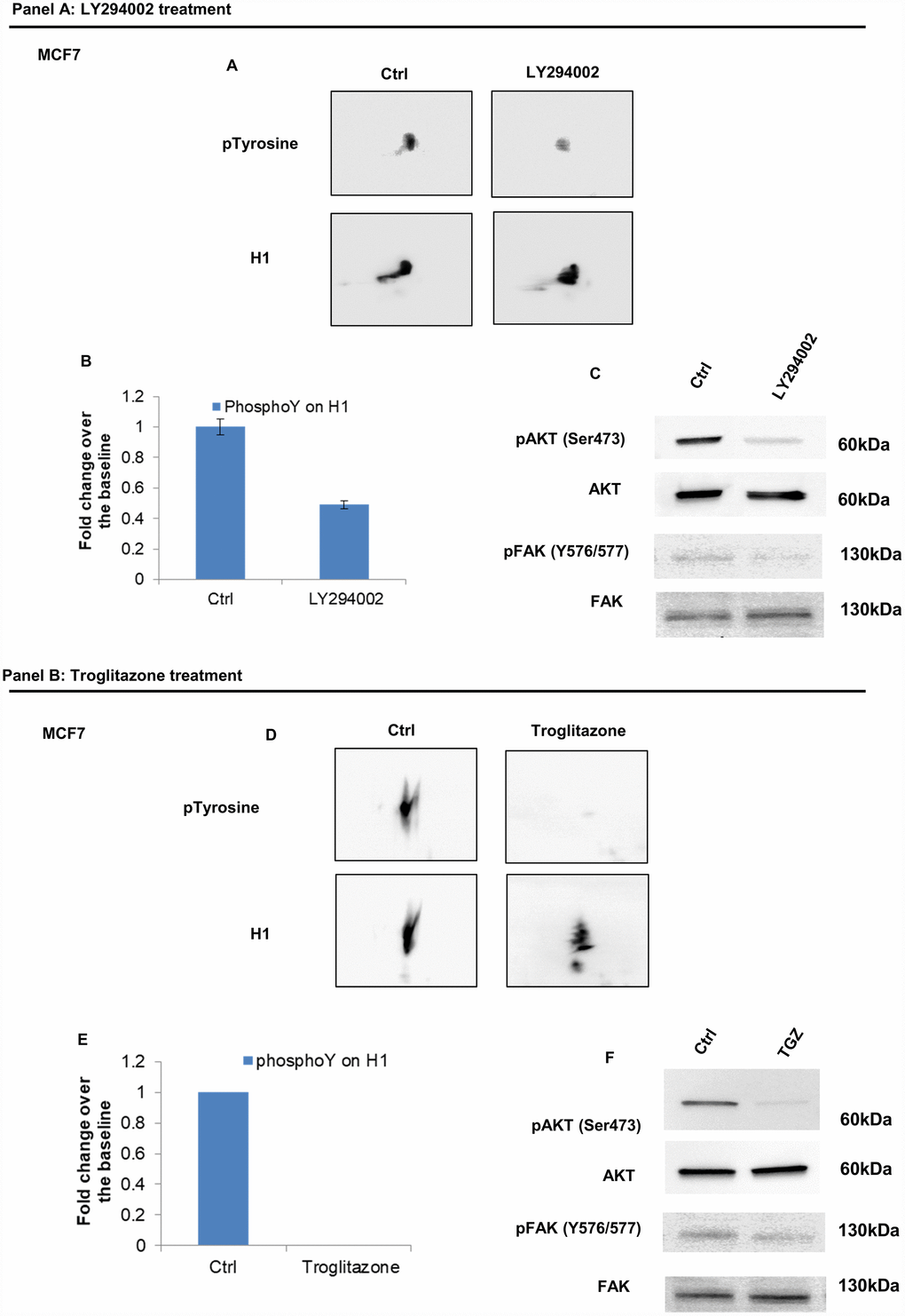 Figure 7. Analysis of H1 histone tyrosine phosphorylation following LY294002 and Troglitazone treatments in MCF7 cells. (Panel A) (A) 2D TAU Western blot analysis of histone H1 tyrosine phosphorylation level (upper panel) and relative normalization with H1 antibody (lower panel) after treatment of MCF7 with LY294002; All WB images were acquired in 4 seconds. (B) Densitometry analysis of H1 tyrosine phosphorylation spots; (C) Western blot analysis of pAKT, and pFAK (Y576/577) levels in protein extracts from LY294002 treated cells. Phospho-Akt (ser473) and pFAK (Y576/577) signals were normalized to the corresponding total Akt and total FAK, respectively. (Panel B) (D) 2D TAU Western blot analysis of histone H1 tyrosine phosphorylation level (upper panel) and relative normalization with H1 antibody (lower panel) after treatment of MCF7 with Troglitazone; All WB 2D images were acquired in 4 seconds. (E) Densitometry analysis of H1 tyrosine phosphorylation spots; (F) Western blot analysis of pAKT, and pFAK (Y576/577) levels in protein extract from Troglitazone treated cells. Phospho-Akt (ser473) and pFAK (Y576/577) signals were normalized agianst the corresponding total Akt and total FAK respectively. The assays were repeated in three independent biological replicates. Data are expressed as mean ± SEM (N =3).