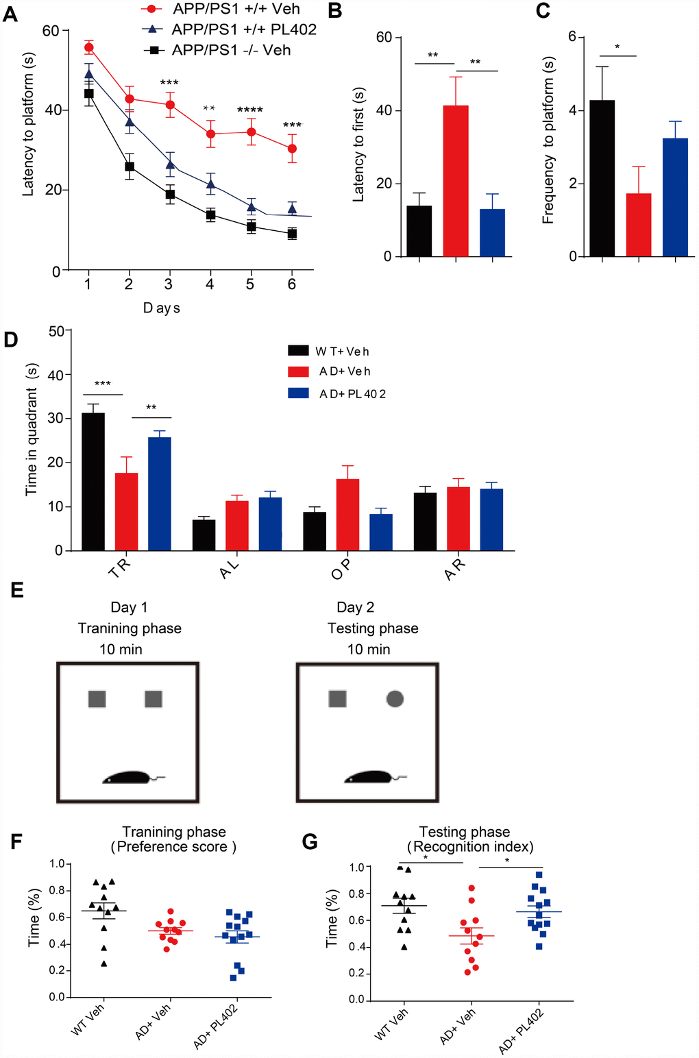 Figure 4. PL402 ameliorates cognitive deficits and improves memory retention in APP/PS1 mice. (A) Morris water maze (MWM) test of wild type (WT) mice and vehicle- or PL402 treated APP/PS1 mice. (B) Latency to platform first of each group mice in day 7 probe trial test. (C) Frequency to platform in probe trial for each group of mice in day 7 probe trial test. (D) Time spent of each group mice in the target quadrant in day 7 probe trial test. TQ, target quadrant; AR, adjacent right; OP, opposite; AL, adjacent left. Data are presented as mean ± SEM, each group n = 6, ∗p < 0.05, ∗∗p < 0.01, ∗∗∗p < 0.001 analyzed by two-way ANOVA (A–D) or one-way ANOVA (B–C) followed by Bonferroni test. (E–G) Diagram of Novel object recognition (NOR) analysis(E). (F–G) Preference scores of training phase (F) and Recognition Index of testing phase (G) during a 10-min testing phase are shown, respectively. Data are presented as mean ± SEM, WT group n = 11, APP/PS1 Vehicle group n = 11, APP/PS1 PL402 group n = 13. ∗p < 0.05, analyzed by one-way ANOVA followed by Bonferroni test.
