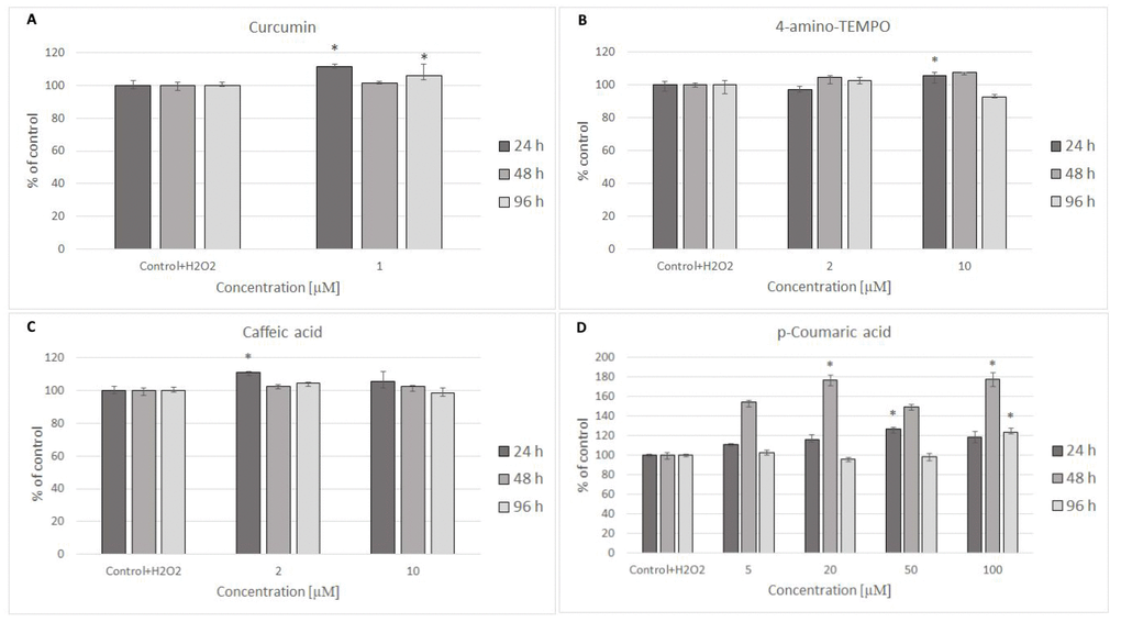 The cells were seeded in a transparent 96-well plate at a density of 5×103 cells/well in 100 μl culture medium and allowed to attach for 24 h at 37°C. After incubation the cells were treated with different antioxidants (TEMPO, 4-amino TEMPO, 4-hydroxy TEMPO, melatonin, ethoxyquin, p-coumaric acid, ferulic acid, gallic acid, aminoguanidine hydrochloride, oleuropein, resveratrol, curcumin, caffeic acid) at 1, 10 and 100 μM concentrations. Working solutions of antioxidants were prepared in culture medium.