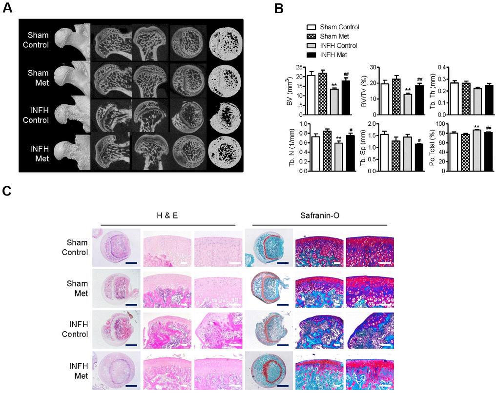 Figure 5. Protective effect of metformin in the INFH rat model. (A) Representative images of μCT in sham-operated rats with saline injection (Sham Control), sham-operated rats with metformin injection (Sham Met), INFH-operated rats with saline injection (INFH Control), and INFH-operated rats with metformin injection (INFH Met). Images are arranged in order of 3D μCT reconstructions of femoral head area and the coronal, sagittal, and middle areas of femoral heads. (B) Morphometric indices in femoral heads of the four groups. Values are presented as the mean ± STD (n = 5). **p < 0.001 versus Sham Control, #p < 0.01 and ##p < 0.001 versus INFH Control. (C) Representative images of H & E and Safranin-O staining in the four groups. Black bars = 500 μm, white bars = 50 μm. Abbreviations: BV, bone volume; Tb. N, trabecular number; Tb.Sp, trabecular separation; Tb.Th, trabecular thickness; TV, tissue volume; Po, porosity.