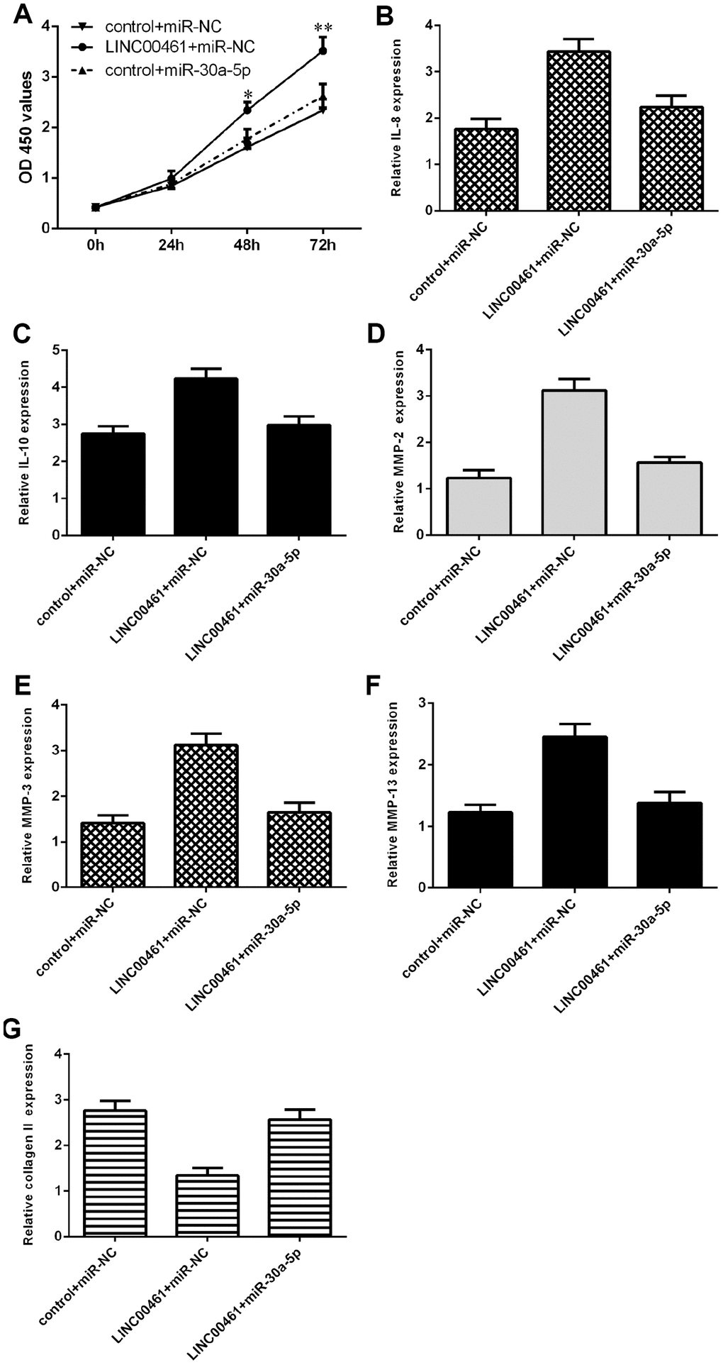 We further explored whether LINC00461 promoted cells growth, inflammation, and ECM degradation by regulating miR-30a-5p in chondrocytes. We demonstrated that LINC00461 overexpression induced chondrocyte proliferation, while ectopic expression of miR-30a-5p significantly reversed this effect (Figure 7A). In addition, we showed that elevated expression of miR-30a-5p inhibited IL-8 (Figure 7B) and IL-10 (Figure 7C) expression in LINC00461-overexpressing chondrocytes. Furthermore, we showed that ectopic expression of miR-30a-5p suppressed MMP-2 (Figure 7D), MMP-3 (Figure 7E) and MMP-13 (Figure 7F) expression in LINC00461-overexpressing chondrocytes. We demonstrated that miR-30a-5p overexpression enhanced collagen II expression in LINC00461-overexpressing chondrocytes (Figure 7G).
