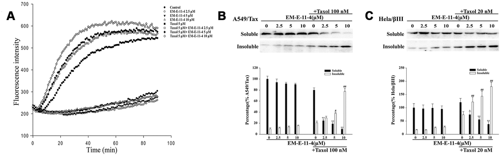 Figure 6. EM-E-11-4 enhanced the effect of paclitaxel-induced tubulin polymerization in vitro. (A) Tubulin polymerization assay. Purified porcine tubulin in reaction buffer was incubated at 37°C with GTP in the absence or presence of the indicated agents. Tubulin polymerization was measured using a fluorescence microplate reader (ex = 370 nm, em = 445 nm) every 1 min for 60min. (B) A549/Tax cells were treated with EM-E-11-4 (2.5, 5, and 10 μM) and/or 100 nM paclitaxel for 48 h. Then, the soluble tubulin and insoluble tubulin were isolated, and the levels of α-tubulin were determined the by Western blot analysis. (C) Hela/βIII cells were treated with EM-E-11-4 (2.5, 5, and 10 μM) and/or 100 nM paclitaxel for 48 h. Then, the soluble tubulin and insoluble tubulin were isolated, and the levels of α-tubulin were determined by Western blot analysis. Columns represent the means±SD values for protein levels obtained from three individual experiments. * p<0.05 and ** p<0.01 vs. Soluble control (A: paclitaxel 100 nM; B: paclitaxel 20 nM), # p<0.05 and ## p<0.01 vs. Insoluble control (A: paclitaxel 100 nM; B: paclitaxel 20 nM).