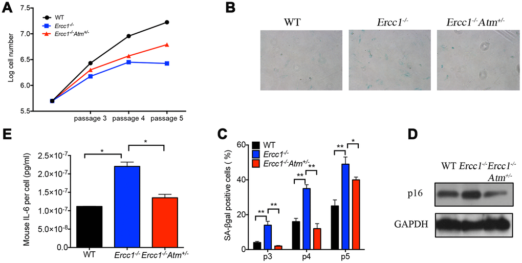 Figure 3. Oxidative stress-induced cellular senescence is reduced by genetic depletion of Atm. (A) Proliferation of WT (black), Ercc1-/- (blue) and Ercc1-/-Atm+/- (red) MEFs serially passaged at 20% oxygen was measured by an automated cell counter. Data shown are representative of three independent experiments using distinct MEF lines. (B) SA-βgal staining of serially passaged MEFs cultured at 20% oxygen. Shown are representative images of passage 5 WT, Ercc1-/- and Ercc1-/-Atm+/- MEFs taken at 10x magnification. (C) The average percentage of SA-βgal positive cells at each indicated passage. Ten fields were acquired and quantified per sample. Data shown are representative of two independent experiments. (D) Senescent WT, Ercc1-/- and Ercc1-/-Atm+/- MEFs (passage 5) cultured at 20% oxygen for 72 hrs were collected and lysed for immunoblot analysis of p16INK4a. (E) Supernatant collected from senescent WT, Ercc1-/- and Ercc1-/-Atm+/- MEFs was analyzed by ELISA for secreted IL-6. Graphs represent mean+/- s.e.m. P value was determined using Student’s t-test. *p<0.05, **p<0.01.