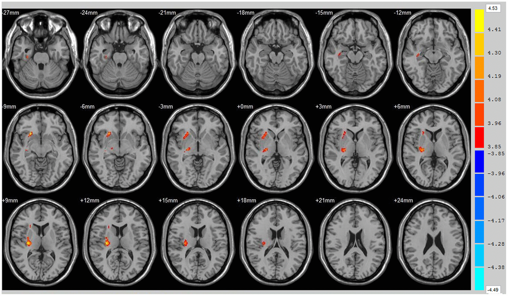 DTI data preprocessing was carried out using FSL 5.0 (FMRIB Software Library, http://www.fmrib.ox.ac.uk/fsl/) based on Oracle VM VirtualBox. First, the lesion located in the left brain was flipped to the right along the mid-sagittal line and the b0 image of each subject was skull-stripped using the brain extraction tool. The data were then corrected for head motion and image distortion caused by eddy currents, and the diffusion sensitizing gradients (“bvecs”) were rotated to correct for motion. Using FDT, the diffusion tensor model was fit to the data, from which FA and MD images were calculated. For DTI data analysis, SPM8 (Statistical Parametric Mapping, SPM8-http://www.fil.ion.ucl.ac.uk/spm/) based on MATLAB was used. The diffusion maps for each subject were normalized to the Montreal Neurologic Institute (MNI) space using the echo plane image (EPI) template. Thereafter, we carried out a two-sample t-test in SPM8. Brain areas showing significant differences between the ICH and control groups were overlaid on the standard CH2 structure image template, showing the cross section cutting layer. The statistical threshold set as P < 0.001, and voxel clusters over 100 voxels were displayed.