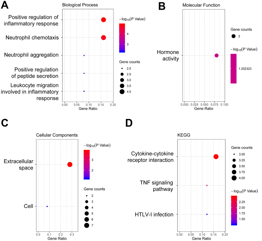 Figure 3. Functional enrichment analysis of DEGs. (A) GO analysis of biological process. (B) GO analysis of molecular function. (C) GO analysis of cellular components. (D) KEGG pathway enrichment analysis. DEGs, differentially expressed genes. Dot sizes represent counts of enriched DEGs, and dot colors represent negative Log10-P values.