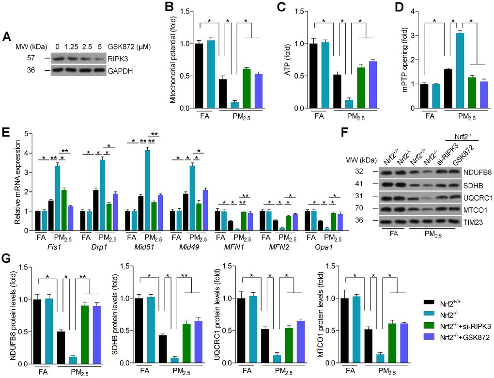 Figure 8. Nrf2 modulates RIPK3 expression to regulate mitochondrial disorder in PM2.5-exposed cardiomyocytes. (A) Cardiomyocytes were treated with the indicated concentrations of GSK872 (0, 1.25, 2.5 and 5 μM) for 2 h, followed by western blot analysis of RIPK3. n = 6 in each group. (B–G) Cardiomyocytes isolated from Nrf2+/+ or Nrf2-/- mice were pre-treated with GSK872 (15 μM) for 2 h, or transfected with si-RIPK3 for 24 h. Then, all cells were exposed to PM2.5 (100 μg/ml) for another 24 h. After treatments above, all cells were collected for further studies. (B) Mitochondrial potential results by JC-1 analysis. n = 8 in each group. (C) Intracellular ATP levels were measured. n = 8 in each group. (D) Results of mPTP opening in cells. n = 8 in each group. (E) RT-qPCR analysis of Fis1, Drp1, Mid51, Mid49, MFN1, MFN2 and Opa1 in cells. n = 6 in each group. (F, G) Western blot analysis of NDUFB8, SDHB, UQCRC1 and MTCO1 in the mitochondrial fractions. n = 6 in each group. Data were expressed as the mean ± SEM. *P < 0.05 and **P < 0.01.