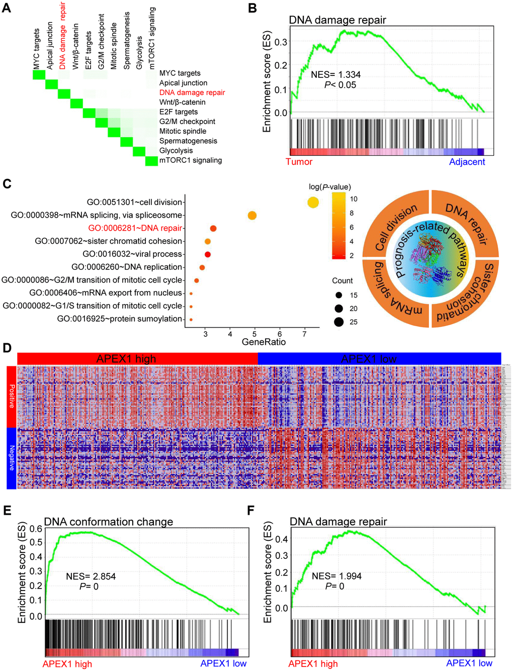 Figure 10. High APEX1 expression positively correlates with DNA damage repair in HCC patients. (A) The top ten signaling pathways in HCC tissues based on gene set enrichment analysis (GSEA) are shown. (B) Enrichment plot shows the status of DNA damage repair pathways in HCC and adjacent normal liver tissue samples. (C) The most significant survival-associated genes in the HCC tissues according to analysis using the GEPIA portal and the most enriched genes in HCC tissues based on the gene ontology (GO) analysis are shown. The right panel shows the top four prognosis-related pathways that are enriched in the HCC tissues. (D) The median mRNA levels of genes that co-express with APEX1 in HCC tissues are shown. (E, F) The enrichment plot shows GSEA analysis of genes involved in DNA conformation change and DNA damage repair in the HCC tissues.