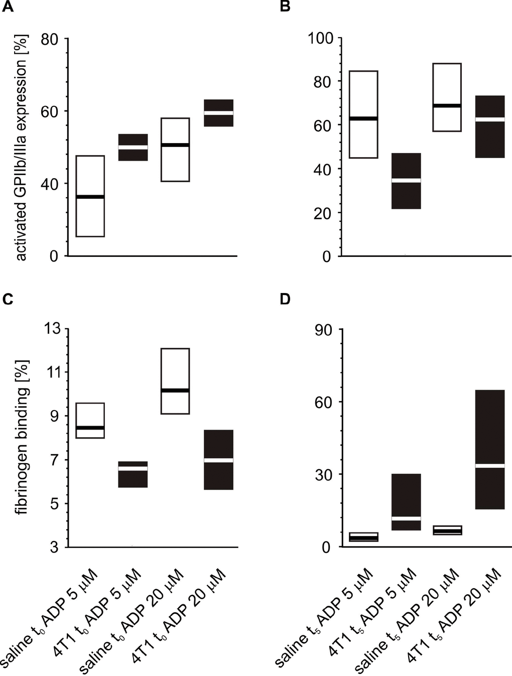 Figure 7. Expressions/bindings of selected platelet surface membrane activation markers on ADP-activated blood platelets in mice injected with 4T1 cancer cells or saline. Results are presented as median (horizontal line) and interquartile range (box) (n = 8). The expressions of the active form of GPIIb/IIIa (A, B) and binding of endogenous fibrinogen (Fg) (C, D) on platelets stimulated with ADP (5 or 20 μM) were measured using flow cytometry in non-fixed ‘washed blood’ withdraw immediately (t0) (A, C) or after 5 weeks (t5) (B, D) from the injection of 4T1-cells or saline. Results are expressed as the percent fraction of platelets positive for a given activation marker. More experimental details are given in the Materials and methods section. The statistical significance of differences, estimated with Kruskal-Wallis test followed by post hoc Conover-Inman all-pairwise comparisons or two-way ANOVA followed by Tukey’s multiple comparisons test, was: active form of GPIIb/IIIaADP5μM, P1,α < 0.01, 4T1 t0 > saline t0; P1,α < 0.01, 4T1 t5 < saline t5; active form of GPIIb/IIIaADP20μM, P1,α < 0.01, 4T1 t0 > saline t0; P1,α < 0.01, 4T1 t5 < saline t5; FgADP5μM, P1,α < 0.01, 4T1 t0 < saline t0; P1,α < 0.01, 4T1 t5 < saline t5; FgADP20μM, P1,α < 0.01, 4T1 t0 < saline t0; P1,α < 0.01, 4T1 t5 < saline t5.