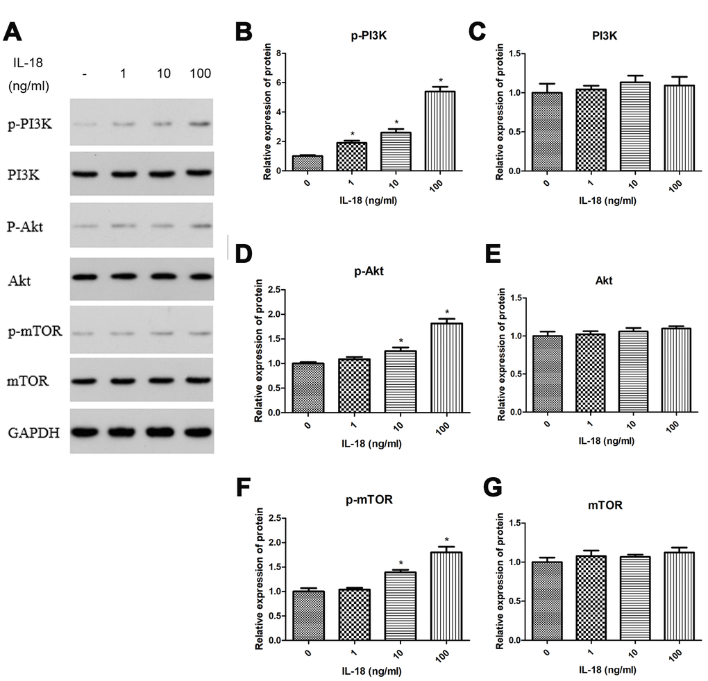 Figure 6. IL-18 stimulation induced autophagy deficiency via PI3K/Akt/mTOR signaling pathway. The chondrocytes were treated with IL-18 at different concentrations for 24 h. Protein levels of p-PI3K (B), PI3K (C), p-Akt (D), Akt (E), p-mTOR (F), mTOR (G), and GAPDH as an internal control in total extract, analyzed by Western blot (A). The values are expressed as mean ± standard deviation (SD). Significance was calculated by a one-way ANOVA with a post hoc Tukey's multiple comparisons test. *p<0.05 versus 0 ng/ml IL-18 treated group.