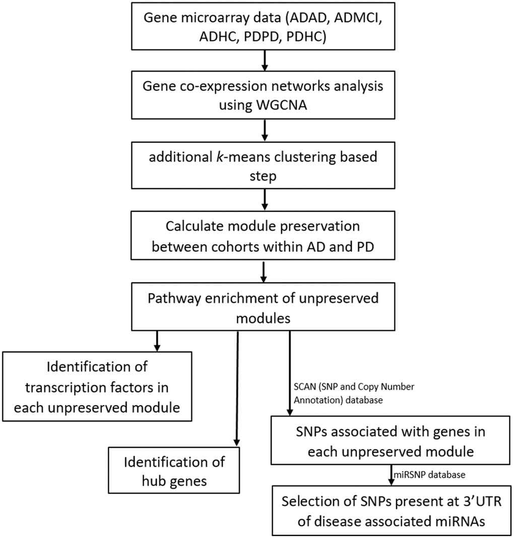 Figure 1. Workflow of our analysis. Filtered and normalized microarray data were separated into five datasets: AD disease (ADAD), healthy control (ADHC) and MCI (ADMCI) data from the AD dataset, and the PD disease (PDPD) and healthy control (PDHC) data from the PD dataset. On each dataset gene co-expression networks analysis was performed using the WGCNA R package [15]. An additional k-means correction step to reduce number of misplaced genes [70] was then performed and module preservation between cohorts within AD and PD was found using NetRep (v.1.2.1) [18]. The pathways associated with non-preserved modules were then found using the Enrichr web tool [19, 20] and hub genes and transcription factors in these non-preserved modules identified. The SCAN (single nucleotide polymorphism (SNP) and Copy number ANnotation) database) database [25] was used to find SNPs associated with the genes in each non-preserved module and these SNPs used to search the MiRSNP database to find the SNPs at 3’ UTR of disease associated miRNAs.