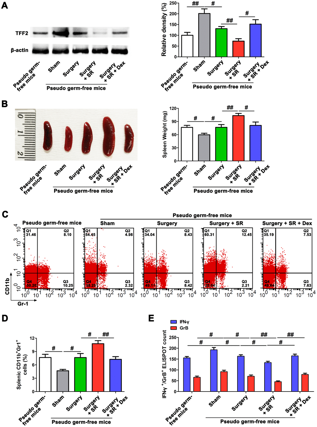 Figure 5. Dexmedetomidine (Dex) attenuated postoperative sleep-restriction (SR)-induced decrease in splenic trefoil factor 2 (TFF2) expression, increase in myeloid-derived suppressor cells (MDSCs) expansion and decrease in splenic CD8+ cells activity via improving gut microbiota disturbance. (A) Western blotting analysis of splenic TFF2 expression in sham-operated mice and pseudo-germ-free mouse received fecal microbiota transplantation (FMT). (B) Spleen weight in sham-operated mice and pseudo-germ-free mouse received FMT. (C, D) Flow cytometry analysis of spleen for CD11b+ Gr-1+ MDSCs in sham-operated mice and pseudo-germ-free mouse received FMT. (E) The enzyme-linked immunospot (ELISPOT) assay of the levels of interferon-γ (IFN-γ) and Granzyme B (GrB) in splenic CD8+ T cells from sham-operated mice and pseudo-germ-free mouse received FMT. All data represent mean ± SEM, n = 5; #P < 0.05, ##P < 0.01.