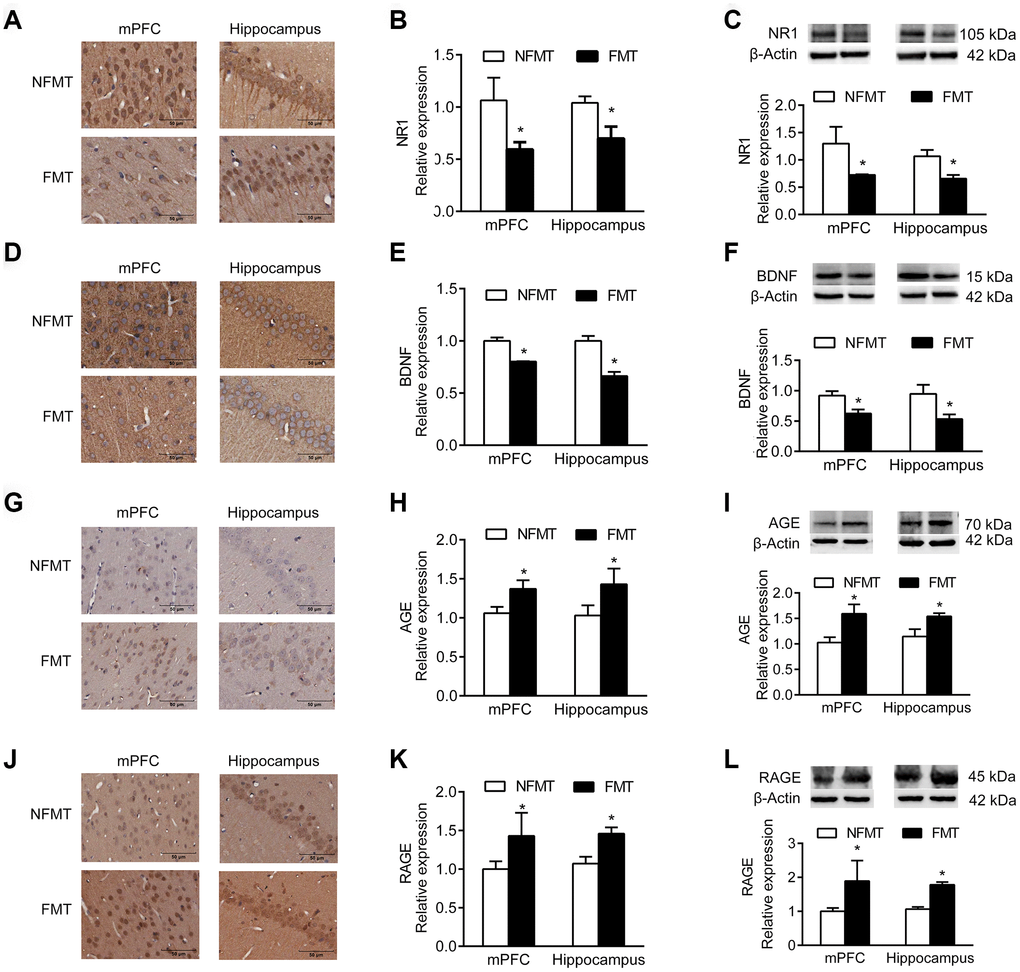 Figure 7. Effect of FMT on expression of molecular markers. n = 3. (A–C) FMT decreases expression of NR1 by IHC (A, B) and western blotting (C). (D–F) FMT decreases expression of BDNF by IHC (D, E) and western blotting (F). (G–I) FMT increases expression of AGE by IHC (G–H) and western blotting (I). (J–L) FMT increases expression of RAGE by IHC (J–K) and western blotting (L). Error bars represent SEM; * P < 0.05 versus the NFMT group.