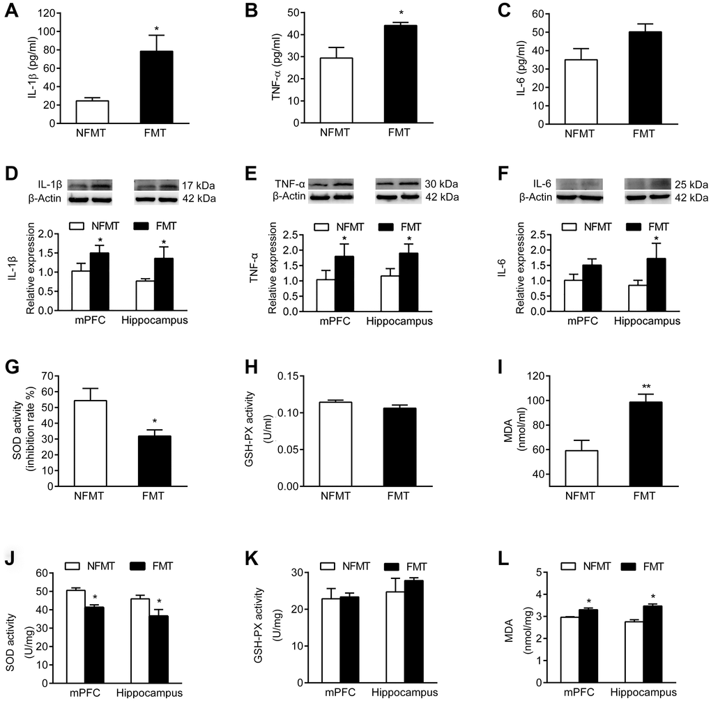 Figure 8. Effect of FMT on inflammation and oxidative stress. n = 6. FMT increases serum levels of IL-1β (A) TNF-α (B) and IL-6 (C). FMT increases expression of IL-1β (D) TNF-α (E) and IL-6 (F) in mPFC and hippocampus. Effect of FMT on SOD activity (G) GSH-PX activity (H) and MDA content (I) in serum. Effect of FMT on SOD activity (J) GSH-PX activity (K) and MDA content (L) in mPFC and hippocampus. Error bars represent SEM; * P < 0.05 and ** P < 0.01 versus the NFMT group.