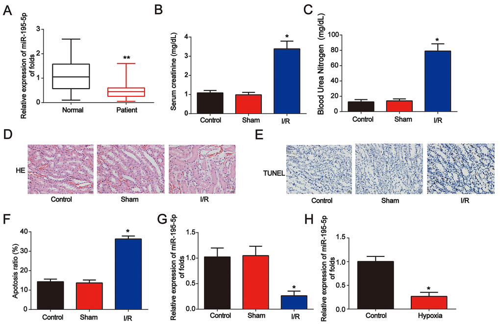 Figure 1. Identification of miR-195-5p in AKI. (A) Analysis of miR-195-5p in serum from healthy controls and patients with AKI. U6 served as a reference control. (B) Serum Cr levels in I/R rat models. (C) BUN levels in I/R rat models. (D) Representative micrographs of renal histologic findings. Scale bars = 20 μm. (E and F) Analysis of apoptosis using the TUNEL assay in renal tissues from AKI rats. (G) miR-195-5p expression in I/R rat models. (H) miR-195-5p expression in NRK-52E cells. Cells were exposed to hypoxia for 6 h. Eight rats were used in each group. Three independent experiments were performed. Error bars represent the mean ± SD of at least three independent experiments. *P < 0.05; **P < 0.01.