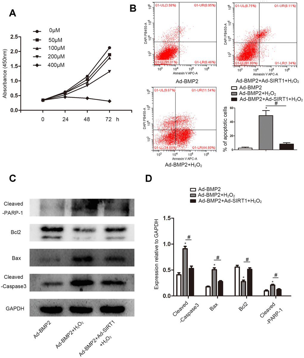 Figure 5. SIRT1 alleviated the apoptosis of BMP2-induced chondrogenic differentiation stem cells under oxidative stress. (A) Cell Counting Kit-8 assay to detect cell proliferation under different concentrations (0, 50, 100, 200, or 400 μM) of H2O2. (B) The cell apoptotic rates were measured using a flow cytometry assay under 200 μM of H2O2. (C, D) H2O2 increased the expression of Cleaved-Caspase3, Bax, and Cleaved-PARP-1 and reduce the expression of Bcl-2 compare to the control group. The Ad-BMP2+Ad-SIRT1+H2O2 group exhibited opposite results. The data are denoted as the mean ± SD.*: p < 0.05 Ad-BMP2+H2O2 vs. Ad-BMP2; #: p < 0.05, Ad-BMP2 + H2O2 vs. Ad-BMP2+Ad-SIRT1+H2O2.
