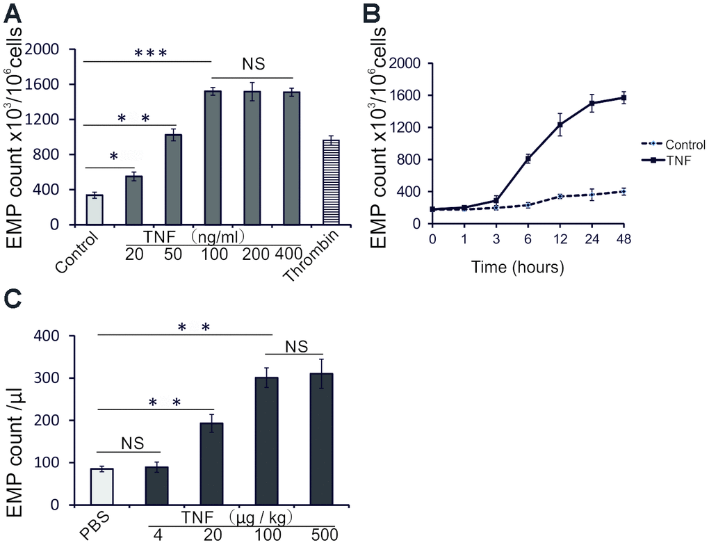 Tumor necrosis factor-α (TNF) is a pro-inflammatory cytokine that has important roles in regulating cell proliferation and apoptosis, inflammation responses, and immune functions [11, 12]. Injection of TNF leads to a disordered endothelial barrier, increased pulmonary microvascular permeability, rearranged cytoskeleton, and increased circulating EMP levels [11, 13, 14]. Growing evidence shows that TNF is a model agent for in vivo and in vitro EMP formation.