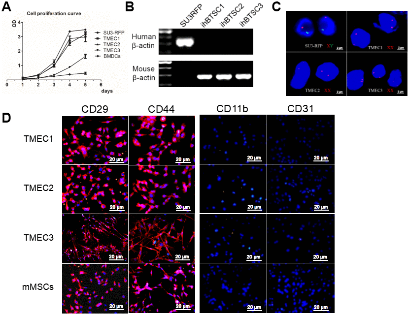 Figure 4. Transformation of host stromal cells. (A) Cell proliferation curve; (B) RT-PCR analysis of human and mouse β-actin expression in SU3 cells and three TMEC lines; (C) FISH assay of chromosomes in SU3 cells and transformed cells; (D) Immunofluorescence of the three tMSC lines. Scale bars: (C) 2 μm; (D) 20 μm.