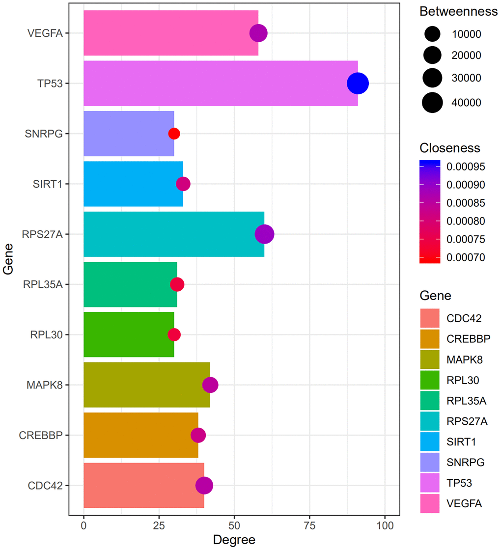 Figure 2 shows the top 100 DEGs from the 3 modules and their chromosomal positions. The top 10 hub genes were TP53, RPS27A, VEGFA, MAPK8, CDC42, CREBBP, SIRT1, RPL35A, RPL30, and SNRPG (Table 1). Figure 3 shows the degree, betweenness, and closeness centrality of the top 10 hub genes. The top three hub genes with the highest degree, betweenness and closeness centrality are TP53, RPS27A, and VEGFA.
