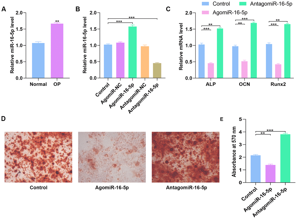 Figure 6. High miR-16-5p levels inhibit osteogenic differentiation in osteoporosis patients and hMSCs. (A) QRT-PCR analysis of miR-16-5p levels in postmenopausal patients with or without osteoporosis (n=10 per group). (B) QRT-PCR analysis of miR-16-5p levels in control hMSCs and hMSCs transfected with agomiR-NC, agomiR-16-5p, antagomiR-NC, and antagomiR-16-5p is shown. (C) QRT-PCR analysis shows the relative expression of osteogenic marker genes, ALP, OCN and RUNX2, in control hMSCs and hMSCs transfected with agomiR-NC, agomiR-16-5p, antagomiR-NC, and antagomiR-16-5p. (D, E) Alizarin red staining shows calcium deposition in control hMSCs and hMSCs transfected with agomiR-NC, agomiR-16-5p, antagomiR-NC, and antagomiR-16-5p for 21 days. Scale bar = 10 mm. Note: The data are represented as means ± SD. *p < 0.05, **p < 0.01, ***p < 0.001.