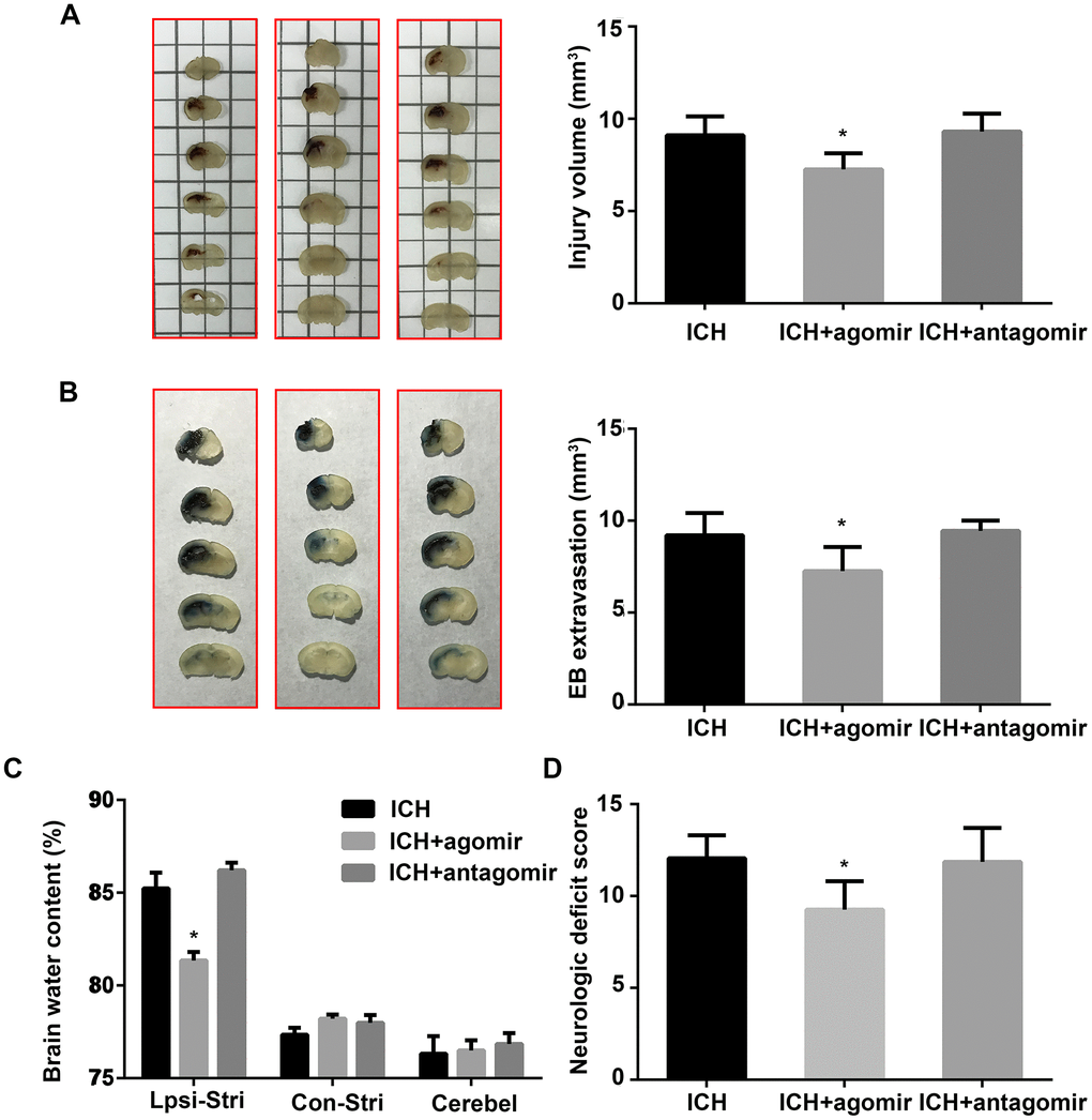 Figure 2. Administration of miR-183-5p reduced neurologic deficits, blood-brain barrier permeability, and brain injury volume after intracerebral hemorrhaging (ICH). (A) Left: representative images of a series of brain slices from different groups at 3 days after ICH. Right: quantitative analysis of hematoma volume. n = 8/group. (B) Left: representative images of brain slices from different groups at 3 days after ICH stained with Evans blue (EB). Right: quantitative analysis of EB extravasation. n = 8/group. (C) Brain water content in the different groups at 3 days after ICH. n = 8/group. Ipsi-Stri, ipsilateral striatum; Con-Stri, contralateral striatum; Cerebel, cerebellum. (D) Neurologic deficit scores of mice at 3 days after ICH. n = 24/group. Values are presented as the mean ± standard deviation. *P < 0.05 vs. the ICH group.