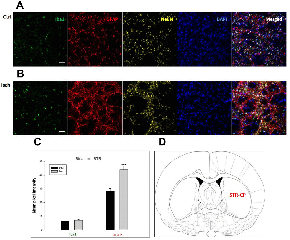 Figure 6. Confocal images of microglia and astrocytes in the post-ischemic striatum-caudoputamen (STR- CP) of the rat brain. Fourfold immunofluorescence labeling microglia with Iba1 (green), astrocytes with GFAP (red), neurons with NeuN (yellow), and nuclei with DAPI (blue). The scale bar represents 50 μm. (A) Ctrl – control brain, (B) Isch – post-ischemic brain, (C) Quantification of the mean pixel intensities for Iba1 and GFAP signals of post-ischemic vs. control animals with 2 years survival. Values are presented as mean ± SEM. *** p<0.001. nCtrl = 16, nIsch = 16, n = number of analyzed cross sections. (D) Schematic representation at rat striatal level with STR-CP region indicated.