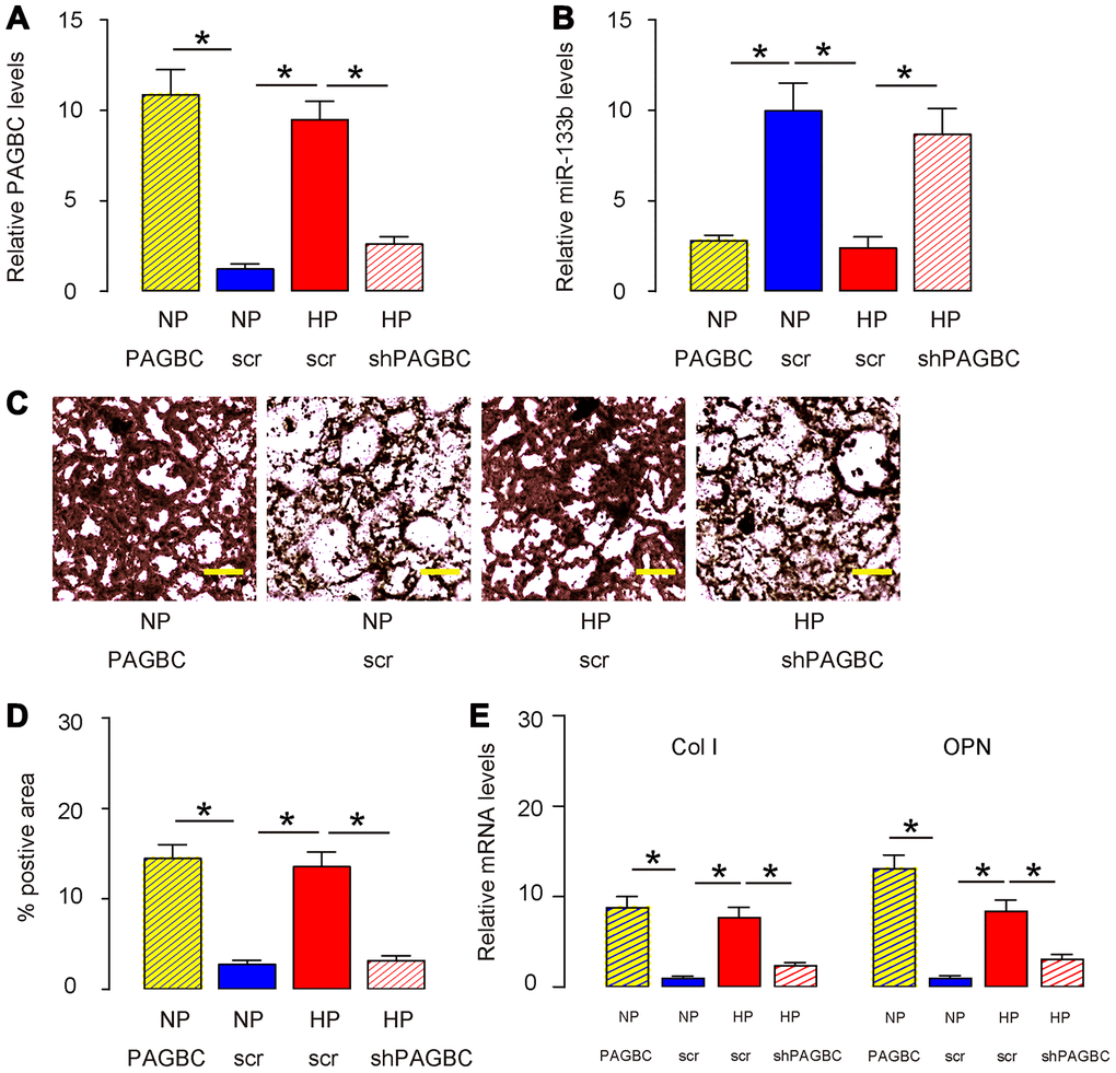 Figure 3. HP induces osteogenic differentiation of AMSCs through PAGBC. AMSCs transfected with scr were kept in either NP or HP, while AMSCs transfected with PAGBC were kept in NP, AMSCs transfected with shPAGBC were kept in HP, to compare with AMSCs in NP and AMSCs in HP, respectively. (A, B) RT-qPCR for PAGBC (A) and miR-133b (B) in AMSCs. (C, D) Osteogenic differentiation of AMSCs was determined by Von kossa staining, shown by quantification (C) and by representative images (D). (E) RT-qPCR for osteogenesis-associated genes, collagen I (Col I) and osteopontin (OPN). N=5. *p<0.05. Scale bars are 50μm.