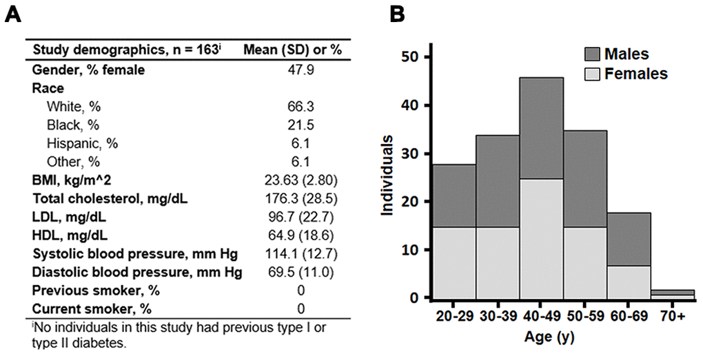 Figure 1. Background characteristics of 163 healthy adults of the predictive medicine cohort. (A) Mean values with standard deviation (SD) of gender, race and clinical measures are shown. (B) Age distribution of the subset. Stacked bars are shown with men in dark gray and women in light gray. Mean age was 43.5 years, and ages ranged from 20 to 90 years.