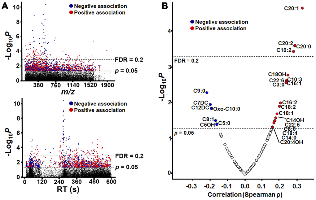 Figure 2. Metabolome-Wide Association Study (MWAS) of plasma metabolites correlated with age. (A) Type 1 Manhattan plot showing -log10p for correlation of each metabolite plotted by m/z (mass-to-charge ratio) and type 2 Manhattan plot showing -log10p for correlation of each metabolite plotted by chromatographic retention time (RT) in seconds, as separated the C18 column. Plots are shown with significance (n = 1505, p = 0.05) and false discovery rate (n= 140, FDR = 0.2) thresholds by dashed lines, and the detailed information of metabolic features is provided in Supplementary Table 1. (B) Plot of acylcarnitine correlation strength and direction (Spearman ρ) by –Log10 p. Acylcarnitines with p < 0.05 are labeled by the chain length, saturation and modification of the acyl group (see Table 1 for details). For acylcarnitines detected on both C18 and anion exchange columns, only the C18 data is represented in the plot. The plot is shown with significance (n = 26, p = 0.05) and false discovery rate (n= 4, FDR = 0.2) thresholds by dashed lines In all plots, significant negative correlations are shown in blue, and significant positive correlations are shown in red.