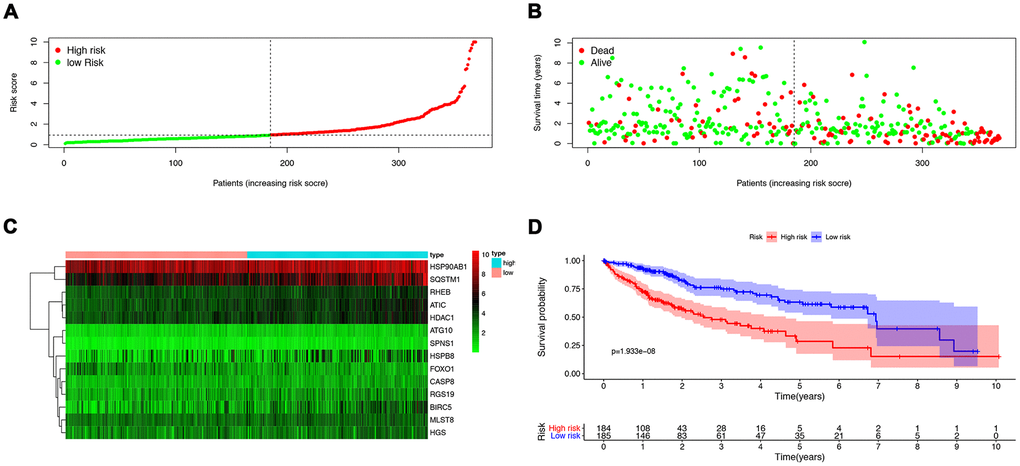 Figure 3. The construction of a prognostic ARG signature. (A) Distribution of prognostic index. (B) Survival status of patients in different groups. (C) Heat map of the expression profile of the included ARGs. (D) Patients in the high-risk group have a shorter overall survival.