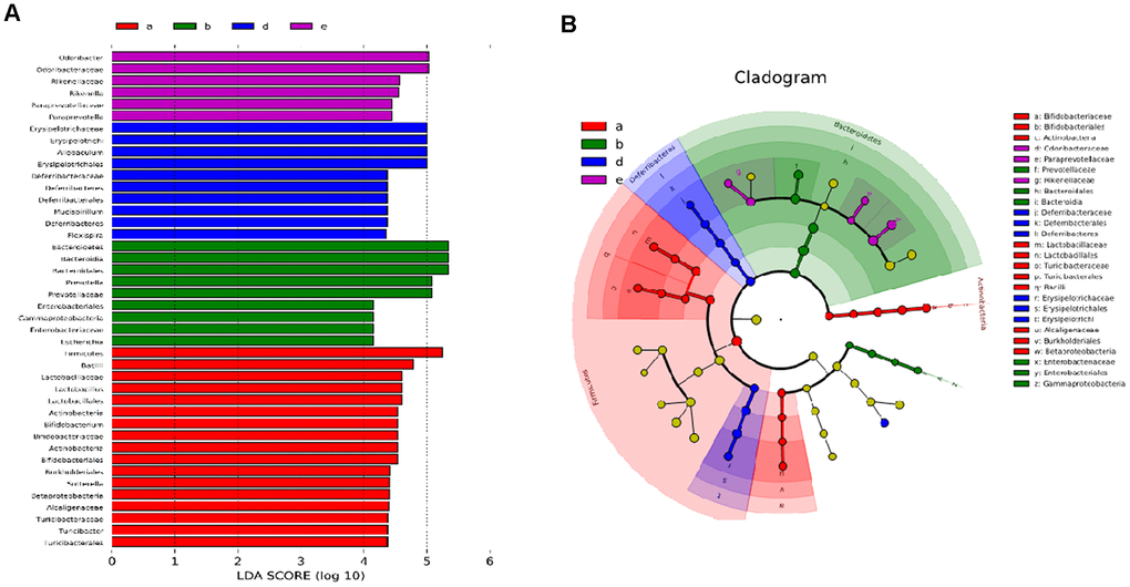 Figure 6. Effect of PSE on gut microflora of type 2 diabetic mice-induced by high-fat diet. The LDA score (A) and profiling of LEFSE (B) analysis. Letters a, b, d, and e in the graph represent 10 mg/kg PSE-treated, 80 mg/kg PSE-treated, the diabetes model, and 140 mg/kg MET-treated groups, respectively.
