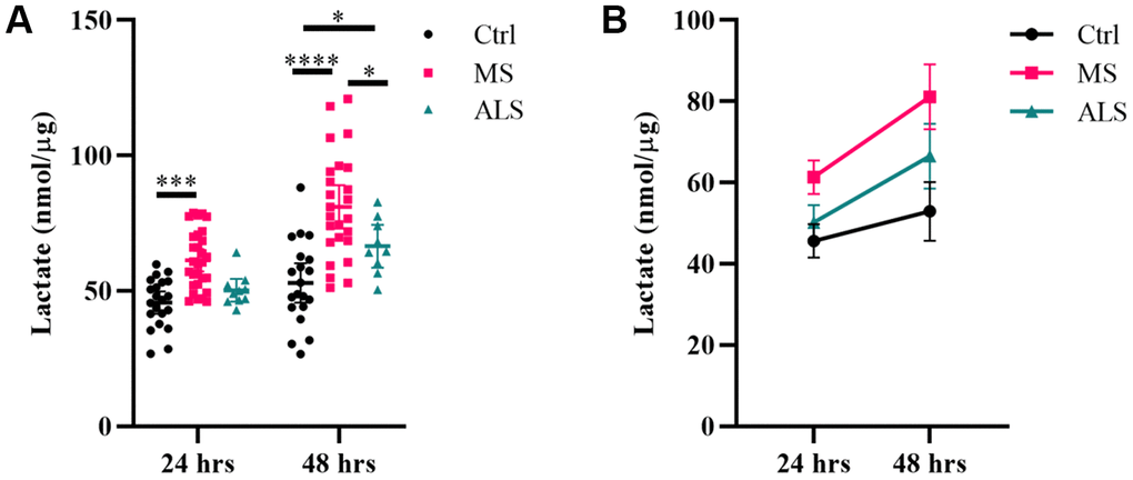 Figure 5. Lactate production is increased in MS skin fibroblasts. Skin fibroblasts from MS (n = 25-29), ALS (n = 9-10), and control cells (n = 20-21) were incubated in media (without FBS) for 24 hours or 48 hours prior to measuring lactate concentrations in the media. (A) Significant changes between groups were determined using two-way ANOVA post hoc Tukey test (repeated measures with mixed model). Each data point represents a unique skin fibroblast sample. Determined lactate concentrations were normalized to cellular protein content. The average of replicates is shown with the 95% confidence interval. (B) Summary data of detected lactate concentrations after 24 or 48 hours. The average of all data is shown per group with the 95% confidence interval. *, P < 0.05, ***, P < 0.001; ****, P < 0.0001. Abbreviations: ALS, amyotrophic lateral sclerosis; Ctrl, control; MS, multiple sclerosis.