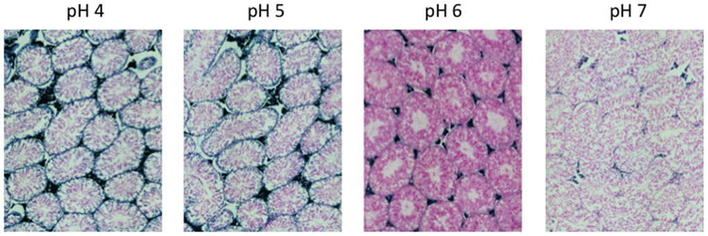 Figure 2. pH-dependent (pH 4 to pH 7) β-gal activity in frozen sections of 9 months old C57/Bl6J mice testes. Nuclear Fast Red was used for counterstaining. At pH 6, specific for SA-β-gal, no marked β-gal activity is evident. Representative images from 3 different mice are shown.