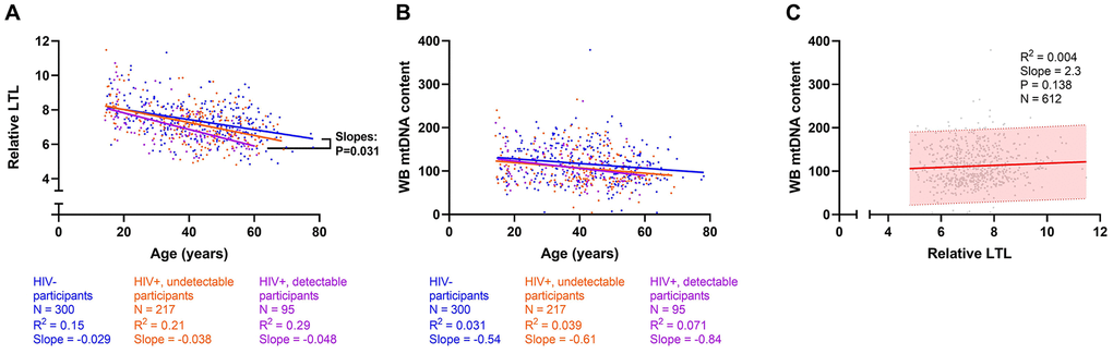 Figure 1. Cross-sectional univariate associations between leukocyte telomere length (LTL), whole blood mitochondrial DNA (WB mtDNA) content, and age. Among 612 participants, (A) LTL declines with age (R2=0.17, Slope=-0.03, Pearson’s P<0.0001); as does (B) WB mtDNA content (R2=0.03, Slope=-0.57, P<0.0001). Both measures also decline within each HIV subgroup (all p<0.01). Linear regressions of HIV-, HIV+ undetectable plasma viral load (pVL), and HIV+ with detectable pVL participants are shown in blue, orange, and magenta, respectively. Differences between slopes were tested and showed that (A) LTL declines faster among HIV+ detectable pVL participants than in HIV- controls. (C) No detectable relationship exists between LTL and WB mtDNA content (P=0.138). The shaded area indicates the 95% prediction interval. Coefficients of determination (R2) are shown.