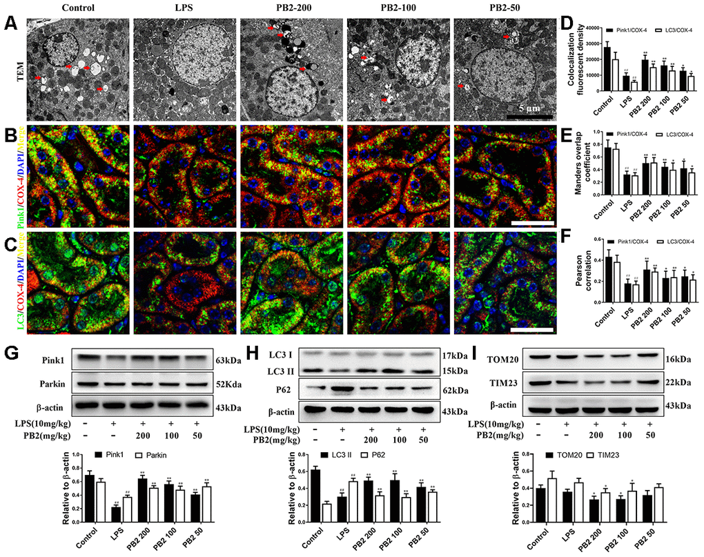 Figure 4. Effects of PB2 on mitophagy (n = 8). Mitochondrial structure in renal tubular epithelial (Bar = 5 μm) (A); co-localization of anti-LC3 (green)/anti-COX IV (red) antibodies (B) and anti-Pink1 (green)/anti-COX IV (red) antibodies (C) (Bar = 25 μm); the co-localization fluorescence intensity, overlap coefficient and Pearson's correlation of LC3-COX IV and Pink1-COX IV (D–F); expression of Pink1, parking, LC3 and p62, and semi-quantification (G–I). #P ≤ 0.05, ##P ≤ 0.01 compared to control mice; *P ≤ 0.05, **P ≤ 0.01 compared to LPS challenged alone.