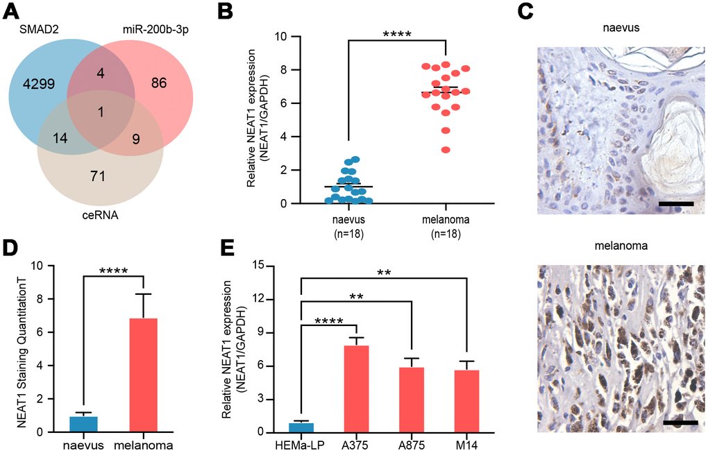 Figure 4. NEAT1 was upregulated in melanoma cells. (A) Venn diagram of intersection of target lncRNAs predicted by bioinformatics analysis. (B) RT-qPCR was performed to measure the level of NEAT1 in benign naevus (n=18) and melanoma tissues (n=18). (C) RNAscope detection of NEAT1 expression in melanoma tissues and benign naevus. Scale bars: 100 μm. (D) Quantitative analysis of NEAT1 expression in melanoma tissues (n=18) and benign naevus (n=18). (E) RT-qPCR was performed to measure the level of NEAT1 in various melanoma cells (A375, A875 and M14) and non-cancer cells, HEMa-LP.