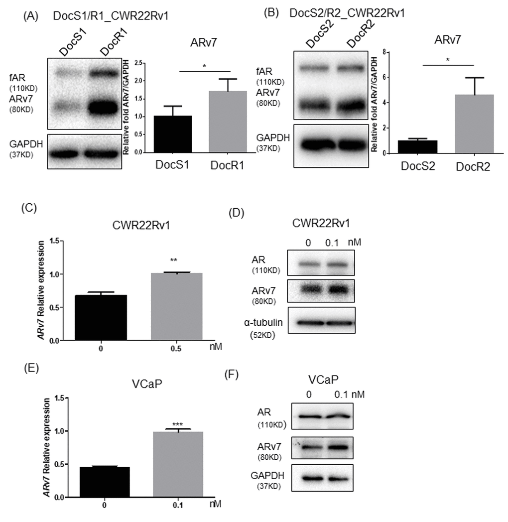 Figure 3. Doc treatment increased ARv7 in CRPC and DocRPC cells. (A, B) ARv7 expression (left panel: immunoblot for protein level; right panel: real-time PCR for mRNA level) is higher in DocR1_ and DocR2_CWR22Rv1 compared to DocS1_ and DocS2_CWR22Rv1 cells. (C–F) Increasing ARv7 expressions at protein levels and mRNA levels upon transient Doc treatment in Doc naïve parental CWR22Rv1 (C, D) and VCaP (E, F) cells. After treating parental CWR22Rv1 or VCaP cells with DMSO or Doc, then ARv7 mRNA (C, E) and ARv7 protein (D, F) were assayed. Results are mean ± SD compared to controls, *p<0.05; **p<0.01; ***p<0.001.