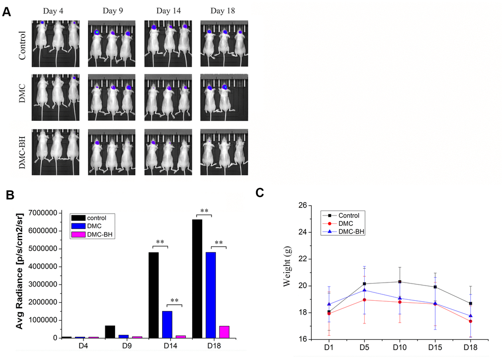 Figure 4. The effects of DMC-BH and DMC on tumor growth in orthotopic glioblastoma xenograft models. (A) U87-Luc xenograft tumor-bearing nude mice were treated with 20 mg/kg DMC-BH, 20 mg/kg DMC or isometric saline for 18 days. The growth of orthotopic glioblastoma xenografts was monitored by BLI. (B) The sizes of orthotopic glioblastoma xenografts were measured using an IVIS spectrum image system. (C) The body weight of animals was measured after DMC-BH, DMC or isometric saline treatment.