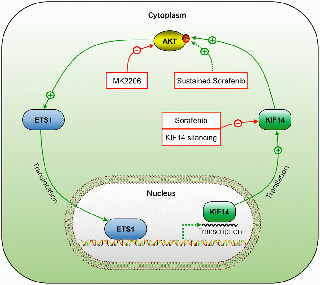 Figure 8. Schematic representation of the activation of AKT–ETS1–KIF14 positive feedback loop during acquired resistance to sorafenib in HCC. +, positive regulation or activation; −, negative regulation or blockade; p, regulation by phosphorylation. The solid line indicates direct interaction, whereas the dotted line indicates indirect interaction.