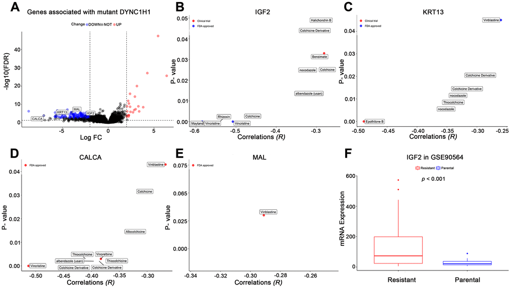 To further explore how mutant DYNC1H1 increase drug sensitivities of MTIs, we used a differential analysis method to identify mutant DYNC1H1 related genes by comparing DYNC1H1 mutated tumor with wild type tumors (37/338) in TCGA-STAD. A total of 199 genes were significantly correlated with mutant DYNC1H1 (23 up-regulated and 176 down-regulated genes) (Figure 6A). Based on NCI-60 cell lines dataset, the expressions of four genes (IGF2, MAL, KRT13, CALCA) were negatively associated with MTIs sensitivities (Figure 6B–6E, p-value < 0.05). Accordingly, IGF2 expression levels were lower in paclitaxel sensitive breast cancer cells than in paclitaxel resistant breast cancer cells in GSE90564 (Figure 6F, p-value < 0.05). Together, these results suggested that the process of mutant DYNC1H1 sensitizing MTIs may be followed by decreased expressions of MTIs related genes such as IGF2, KRT13, CALCA and MAL.