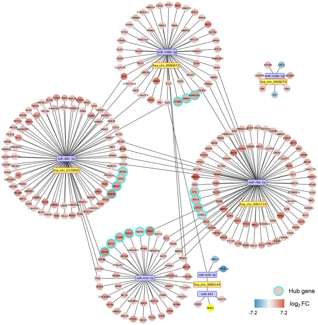 Figure 7. A circular (circ)RNA-micro(mi)RNA-mRNA interacting network in dCCA. The network contains five dysregulated circRNAs, seven miRNAs, 260 mRNAs, and 17 hub genes. The node color changes from blue to red, representing the fold change of mRNA expression value in the cholangiocarcinoma cohort of The Cancer Genome Atlas (tumor versus normal).