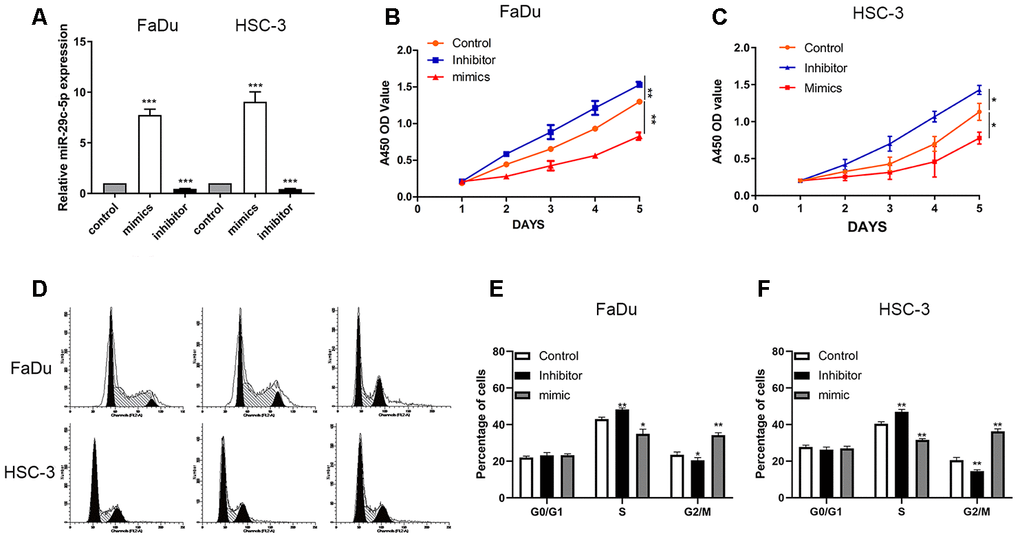 Figure 2. miR-29c-5p regulates the proliferation of FaDu and HSC-3 cells. (A) The levels of miR-29c-5p were significantly higher in FaDu and HSC-3 cells transfected with the miR-29c-5p mimic but lower in cells transfected with the miR-29c-5p inhibitor. (B, C) The results of CCK-8 assays suggest that upregulated miR-29c-5p expression induced by its cognate mimic significantly decreased the cell growth rate compared with the control. Conversely, the growth rates of FaDu and HSC-3 cells transfected with the miR-29c-5p inhibitor were significantly higher compared with the negative control. (D–F) Cell cycle analysis of FaDu and HSC-3 cells transfected with the miR-29c-5p inhibitor shows that the percentages of S-phase cells significantly increased while the percentages of G2/M-phase cells decreased compared with the control (p<0.05). Conversely, upregulation of miR-29c-5p expression decreased and increased the percentages of cells in S phase and G2/M phase, respectively. *p < 0.05, **p < 0.01, ***p < 0.001.