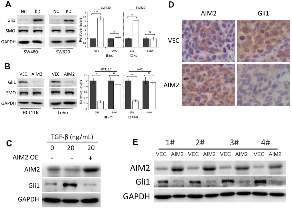 Figure 4. AIM2 inhibits Gli1 expression independent of SMO. (A) Western blots of Gli1 and SMO protein expression in SW480 and SW620 cells stably transfected with control-shRNA (NC) or shRNA against AIM2 (KD). GAPDH as a loading control. Each experiment was performed at least triplicate and the bands were quantified and presented as the mean±SEM. (B) Western blots of Gli1 and SMO protein expression in HCT116 and LoVo cells stably transfected with empty vector (VEC) or plasmid encoding human AIM2 (AIM2). GAPDH as a loading control. Each experiment was performed at least triplicate and the bands were quantified and presented as the mean±SEM. (C) Western blots of AIM2 and Gli1 protein expression in HCT116 cells treated with 20 ng/mL TGF-β for 48 h. (D) Representative images of IHC staining of AIM2 and Gli1 in subcutaneous tumors derived from HCT116 (VEC vs. AIM2) cells. (E) Western blots of AIM2 and Gli1 protein expression in subcutaneous tumors. N, nonsignificant, *P<0.05, **P<0.01, ***P<0.001, based on a two-tailed paired Student’s t-test.