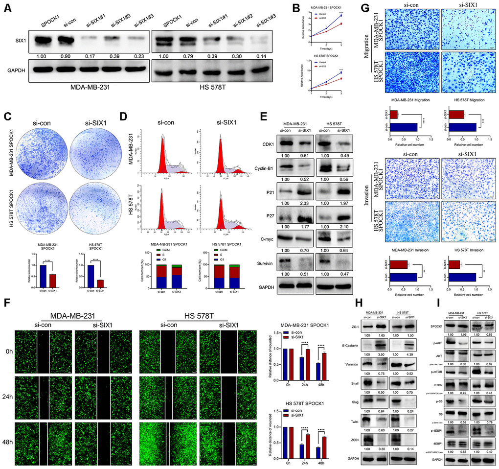 Figure 6. SIX1 involved in SPOCK1-mediated BC progression. (A) MDA-MB-231 and HS 578T cell line were transduced with si-con, si-SIX1#1, si-SIX1#2 and si-SIX1#3. The SIX1 levels in these were verified by western blot analysis after 48 h transfection. (B, C) Cell viability was detected in SPOCK1-overexpressed cells after transduction with si-RNAs by MTT assay (B) and colony formation (C) assay. (D) Cell cycle progression was assayed by flow-cytometry analysis after dealing with si-RNAs. (E) Stable BC cells were treated with si-RNAs. Then cell cycle related protein levels were assayed by western blotting. GAPDH was used as a loading control. (F, G) Cell motility and invasion capacities was detected in SPOCK1-overexpressed cells after treatment with si-RNAs. (H, I) Stable BC cells were treated with si-RNAs. The levels of EMT-related proteins and AKT/mTOR pathway were assayed by western blotting, respectively. GAPDH was used as a loading control. (*P<0.05, **P<0.01, ***P<0.001, ****P<0.0001).