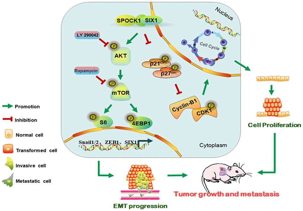 In summary, this study contributed to illuminating the molecular mechanism by which SPOCK1 overexpression in human BC potentiated tumor progression. Our findings indicated that SPOCK1 is aberrantly overexpressed in BC. SPOCK1/SIX1 axis stimulated the AKT/mTOR signaling pathway to accelerate cell cycle progression, promote cell proliferation, trigger EMT progression and facilitate metastasis in BC (Figure 7). SPOCK1 along with SIX1 might be prognostic factors for BC patients and promising therapeutic targets involved in strategies to prevent BC progression.