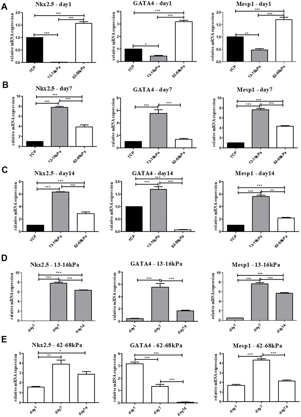 Figure 5. Expression of early myocardial markers on mRNA level. (A–C) The relative mRNA expression of early myocardial markers Nkx2.5, GATA4 and Mesp1 on different matrix of 13-16 kPa, 62-68 kPa and control group at the same time point, the 1st day, the 7th day and the 14th day. On the 7th day and the 14th day, the expression on the 13-16 kPa matrix was highest among the three groups. (D, E) The expression tendency of the three early myocardial markers on the same stiffness changed with time. The highest expression of Nkx2 and Mesp1 on 62-68 kPa and 13-16 kPa emerged on the 7th day, while the expression of GATA4 decreased gradually over time. *P<0.05, **P<0.01, ***P<0.001. n=3.