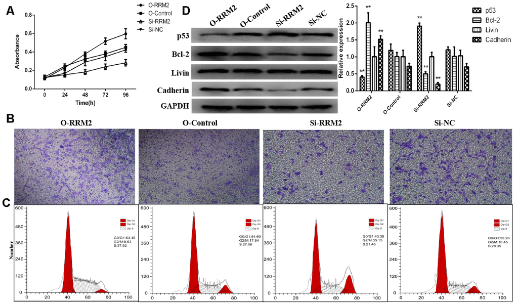 Figure 11. RRM2 promoted cell proliferation and invasion and regulated cell cycle progression of lung cancer cells. (A) CCK-8 proliferation curve of A549 cells transfected with si-RRM2, O-RRM2, si-NC, and O-Control; (B) Transwell assays were performed to evaluate the role of RRM2 on cell invasion; (C) The cell cycle analyzed of A549 cells by flow cytometry; (D) RRM2-associated signaling pathways were determined by western blot assay. *indicates a p-value < 0.05, and **indicates a p-value < 0.01.