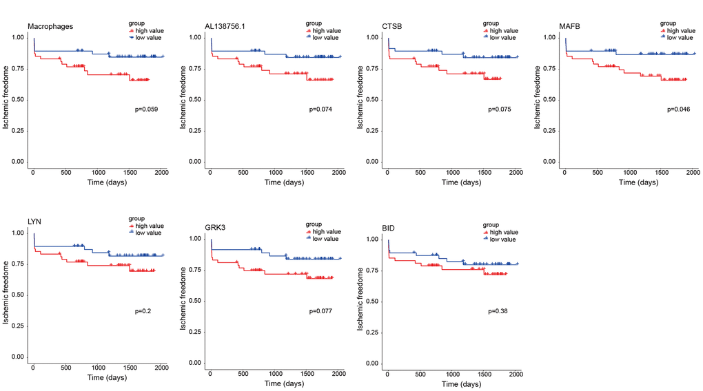 As the constructed macrophage related ceRNA subnetwork may drive atherosclerosis plaque development and rupture, we then investigated their prognostic value to ischemic events. Univariate Cox regression analysis was used to identify the correlation between factors in the subnetwork and ischemic events. Through univariate Cox analysis, CTSB, macrophage GSVA score, AL138756.1, MAFB, LYN, GRK3, and BID were identified as crucial prognostic factors (Table 2). The Kaplan-Meier plots grouped by the median value of each factor were displayed in Figure 8. We then integrated them into a multivariate Cox regression model with age and gender-adjusted (Figure 9A). The C-index was tested as 0.74 which indicates the model to be reliable. Based on the model, a nomogram was established to predict the ischemic freedom probability of atherosclerosis patients (Figure 9B). The calibration curves (Figures 9C) were applied and manifested an acceptable calibration of the nomogram.